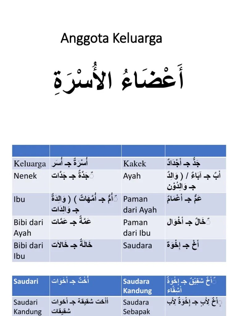 Dalam bahasa arab sendiri, keluarga disebut dengan usroh (اَلْأُسْرَةُ), sedangkan hubungan kekerabatan disebut . Nama ahli keluarga dalam bahasa arab / belajar ahli keluarga dalam bahasa arab tahun 1 youtube. 1 17 bab ii membina keluarga a. Dalam bahasa arab, cucu disebut juga حَفيْد atau سِبْط. Periksa terjemahan 'keluarga' ke dalam arab. Lihat contoh nama keluarga terjemahan dalam ayat, dengar sebutan dan pelajari tatabahasa.